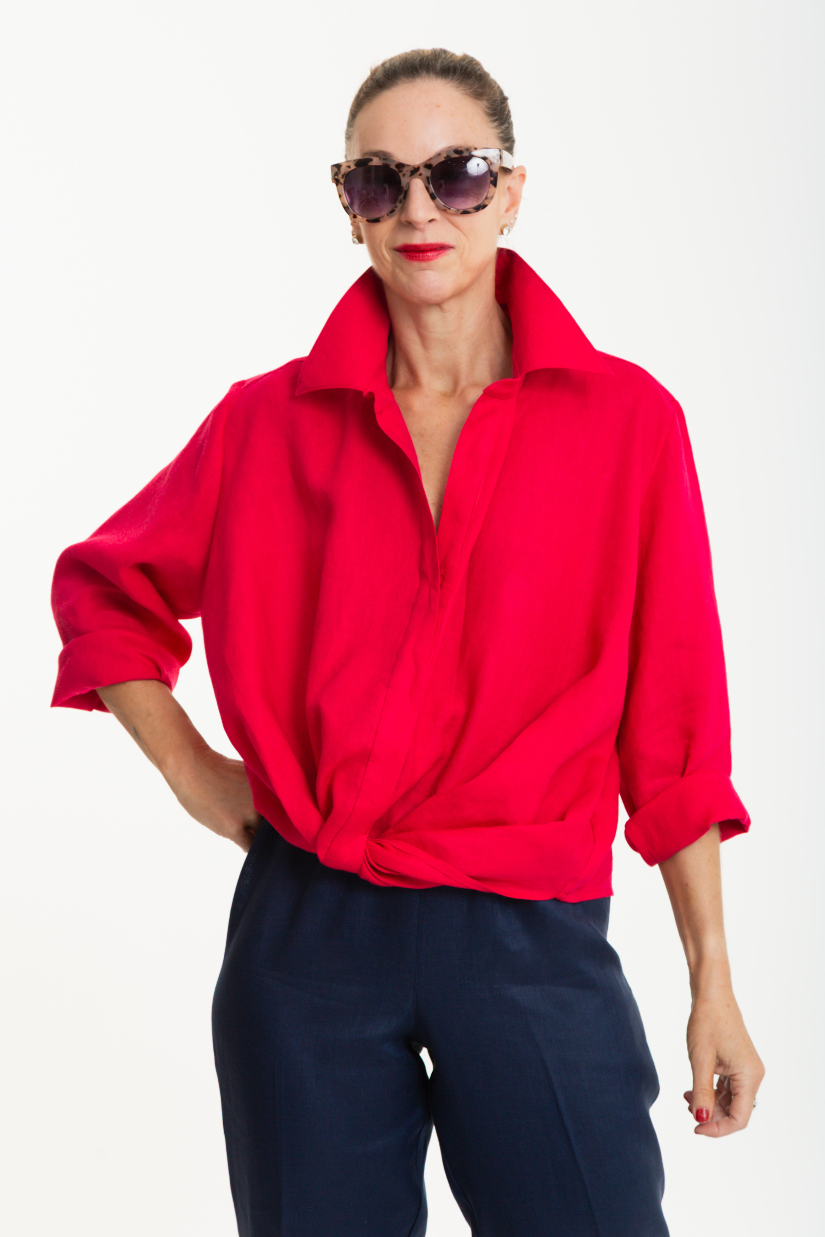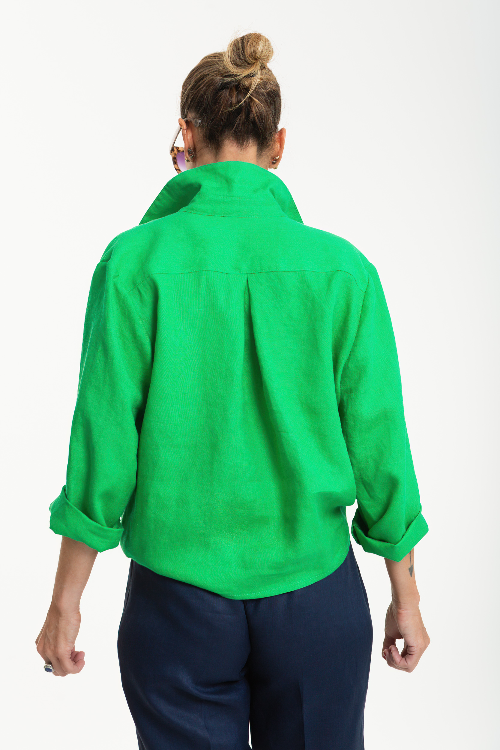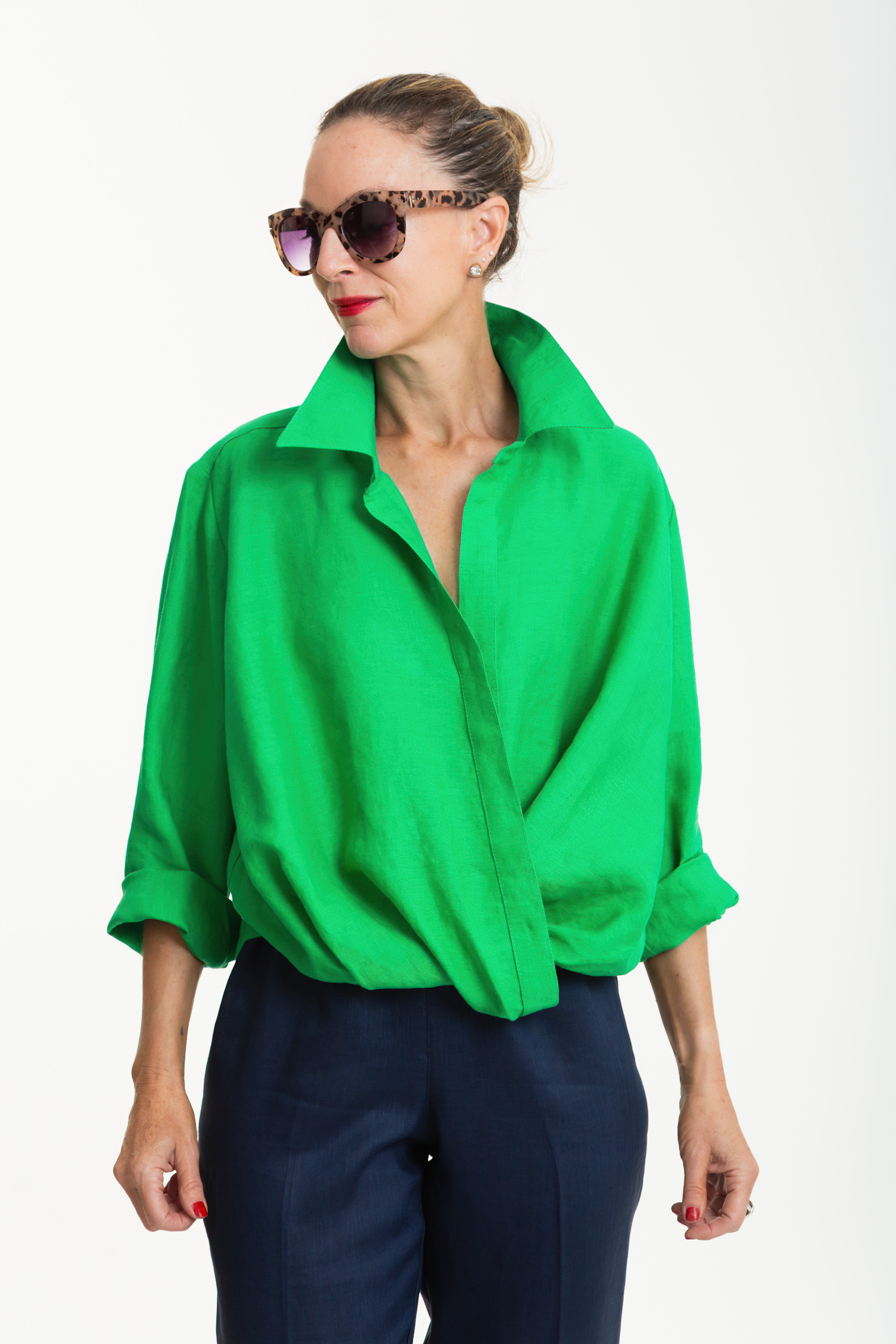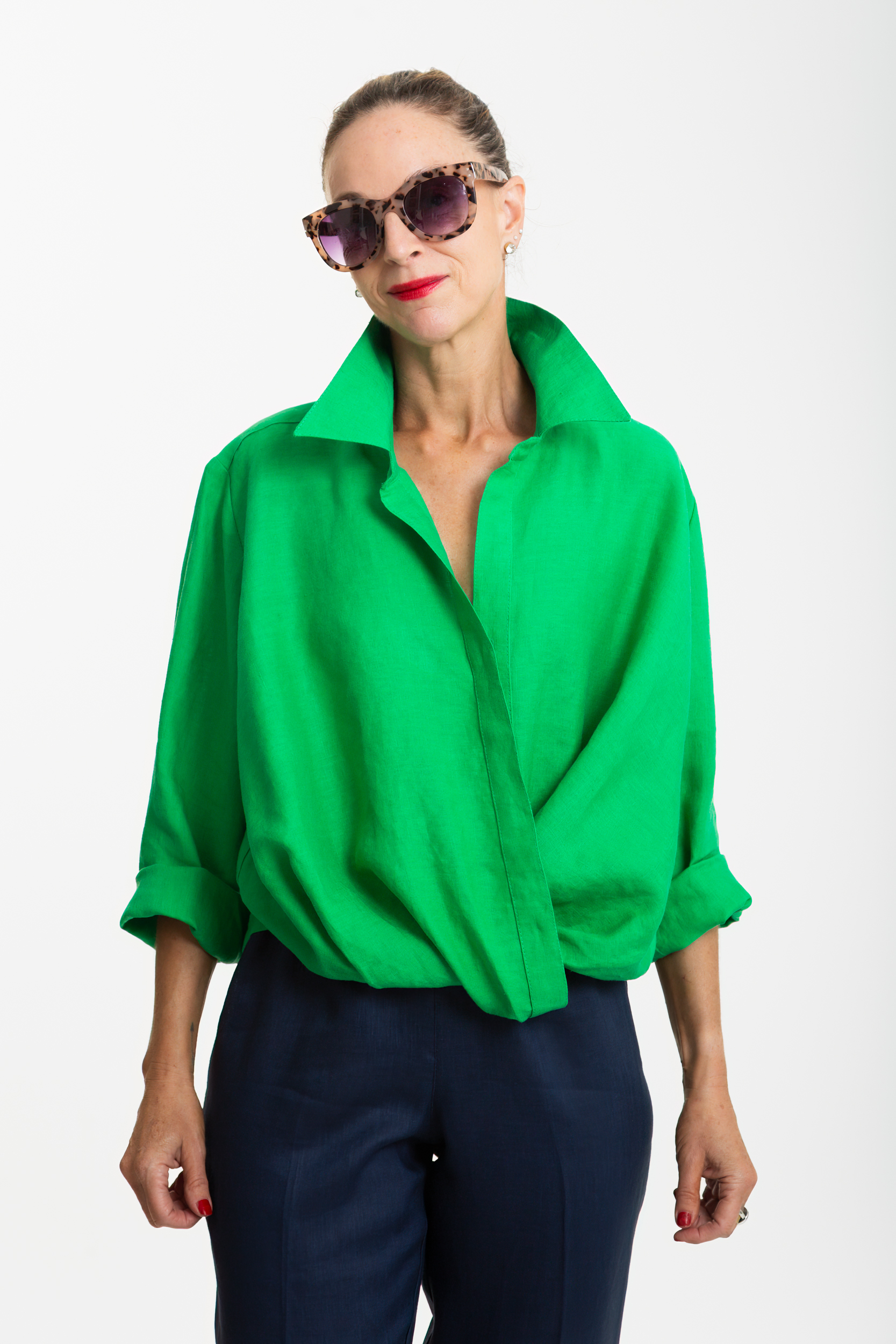 Donatella is a casual pure linen shirt, cut in a relaxed box shape for effortless wear. It features a classic collar with a collar stand, a hidden button fastening down a softly twisted front, and a back yoke with centreback pleat for ease of movement. Set-in sleeves roll up neatly, adding versatility to the look. Light and breathable, Donatella is the perfect everyday piece that balances simplicity with refined detail.