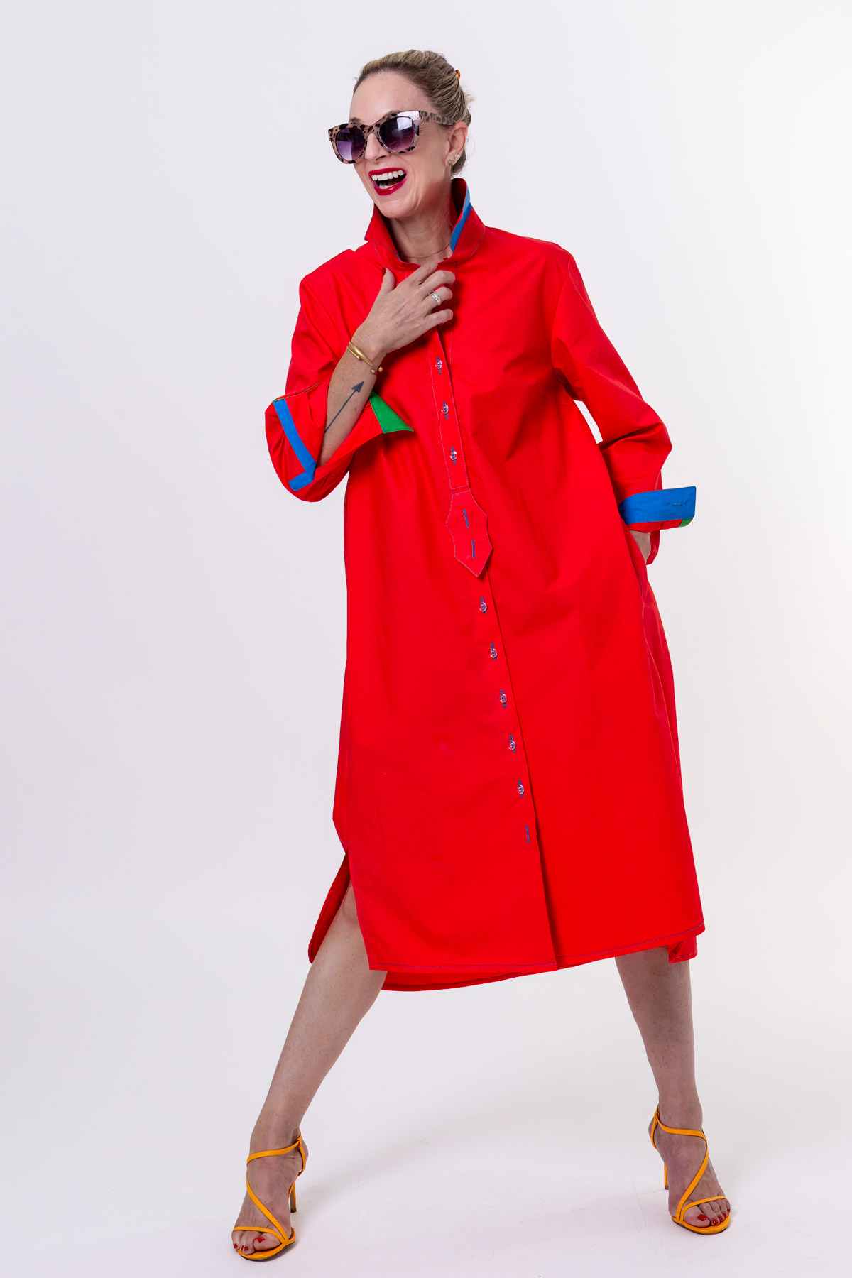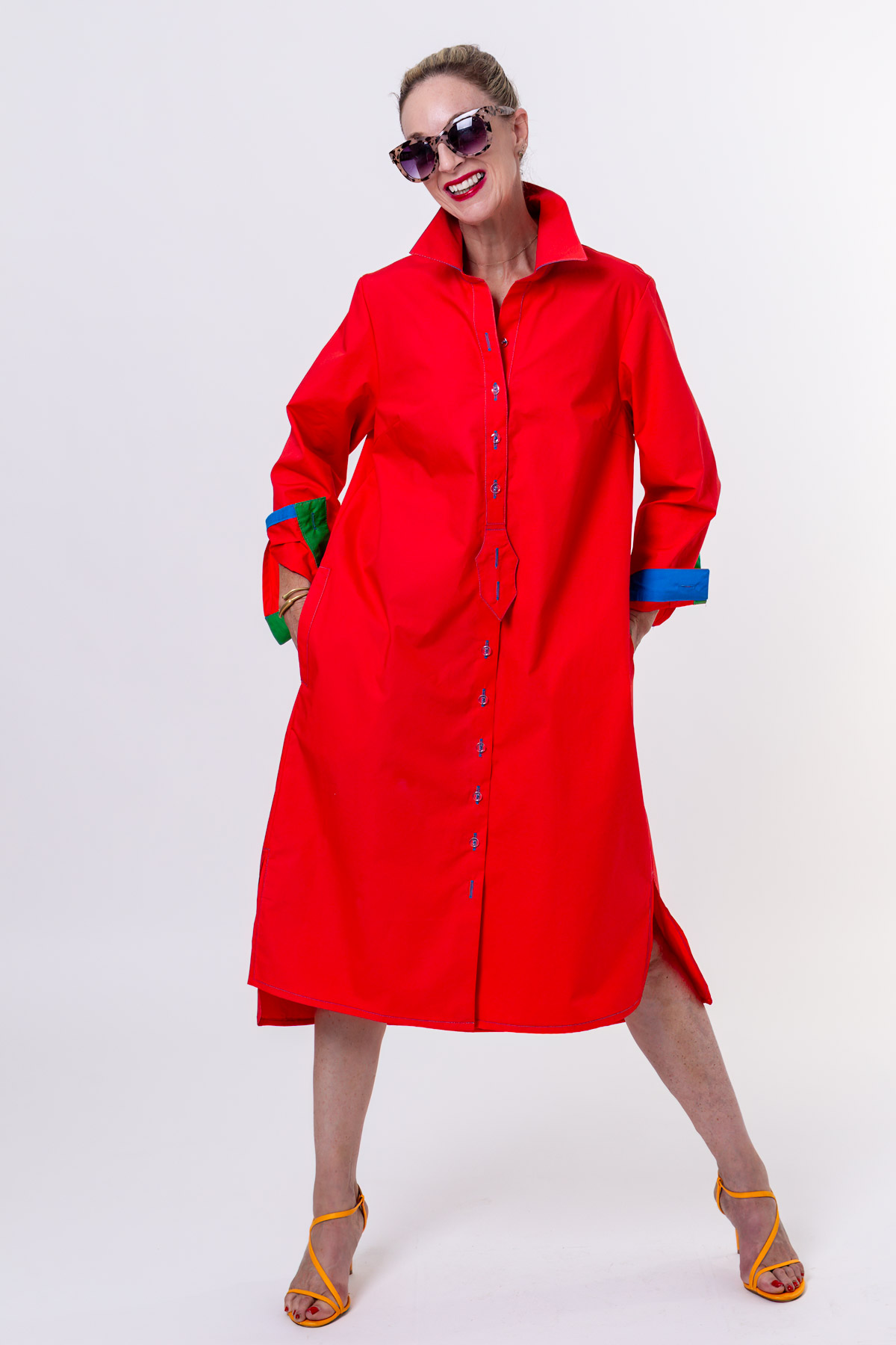 Daronne Naturelle’s pure cotton poplin shirtdress aptly named ‘Expression’ will make a unique addition to your wardrobe and comes in a vibrant pure cotton colour palette with contrast top stitching. This style comes in – Tomato with Green contrast top-stitching and trimmed with Candy, Aqua and Green. This button-through design has a set-in sleeve, sideseam pockets, shaped front tab, side seam splits and shaped hemline.