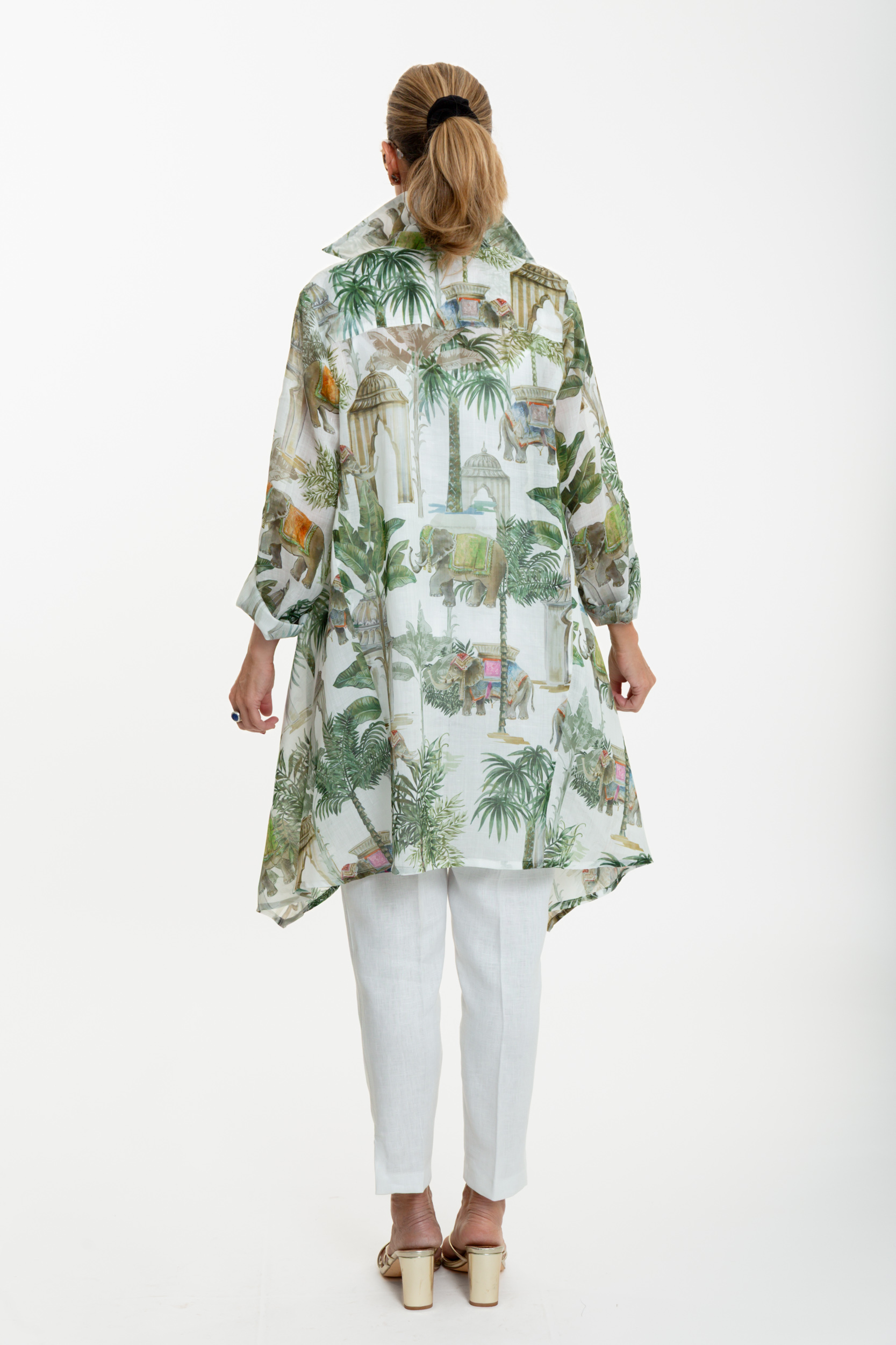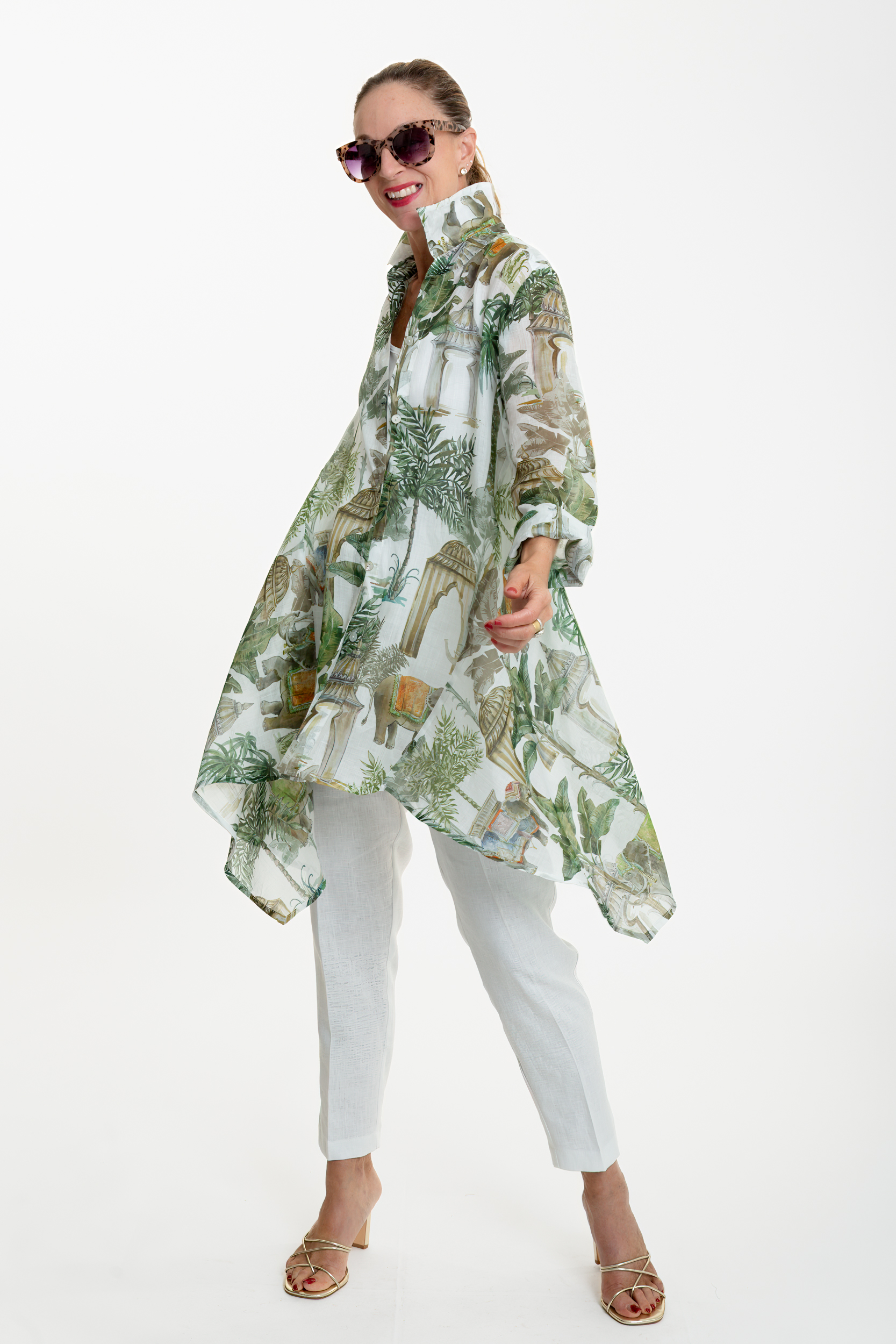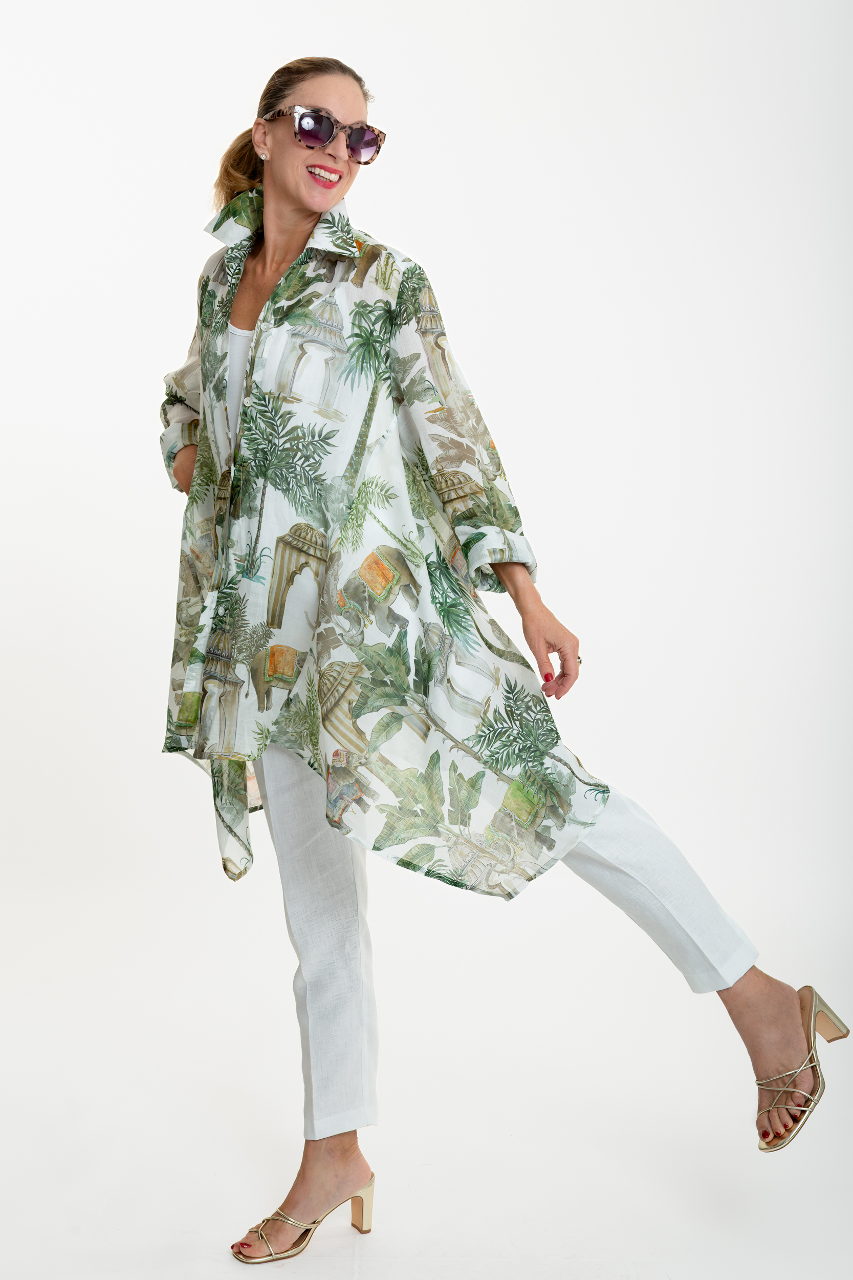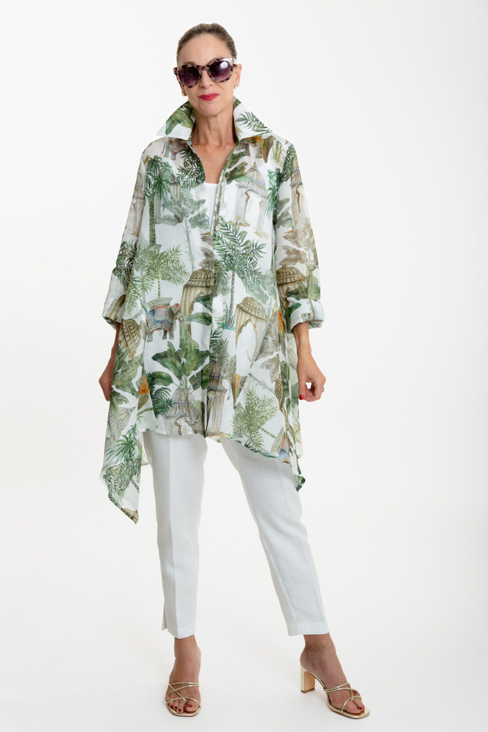 Majestic Sheer is a light and flowing overshirt in fine linen, designed with an elegant handkerchief hemline and a classic shirt collar. The button-down front is finished with delicate shell buttons, while set-in sleeves complete the refined silhouette.